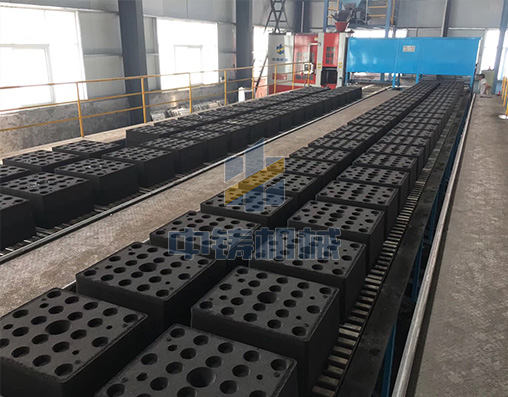 1、全自動造型機(jī)打出來砂型直接在鏈板線上循環(huán)輸送,可以是單排雙列,也可以雙排雙列;